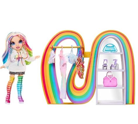 - Amplía tu imaginación con el nuevo Rainbow Closet de Amaya. El juego de regalo todo en uno incluye una muñeca exclusiva con pelo y botas de arco iris, moda adicional que cuelga en el perchero, estantes escalonados, bolsos y zapatos. Los niños se divertirán mucho vistiendo a su muñeca favorita.