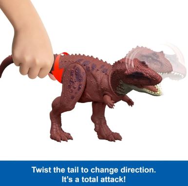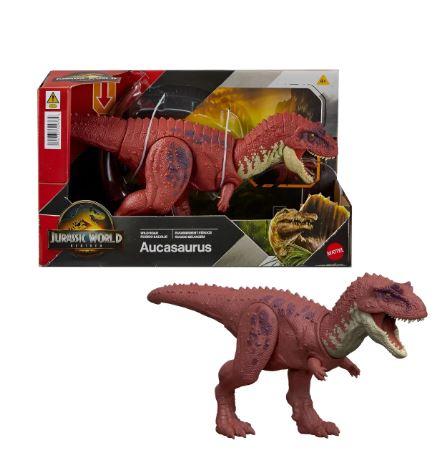 • ¡Ataca y ruge! Esta figura de juguete Wild Roar Aucasaurus inspirada en Jurassic World Rebirth tiene un ataque de mordisco agresivo que puede cambiar de dirección, ¡y un feroz rugido para el juego de batalla de dinosaurios!