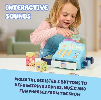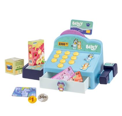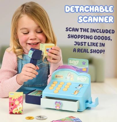 Bluey Juego de Caja Registradora, Registro de Juego Interactivo con Escáner Desmontable, Tarjeta de Crédito de Juguete y Billetes de Dólar, Juguetes de Compras para Niños a partir de 3 Años