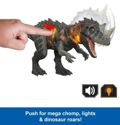 - ¡Ataque, luces, sonido! Este juguete de Ceratosaurus de Jurassic World Wild Roar tiene un movimiento de ataque, efectos de sonido y luz, para un juego de dinosaurios emocionante.