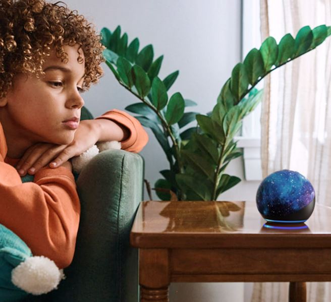 - Echo Dot Kids – Nuestro parlante inteligente con Alexa más popular y adorable diseñado para niños (no es un juguete). El parlante mejorado proporciona voces más nítidas, así como un sonido detallado y vibrante.