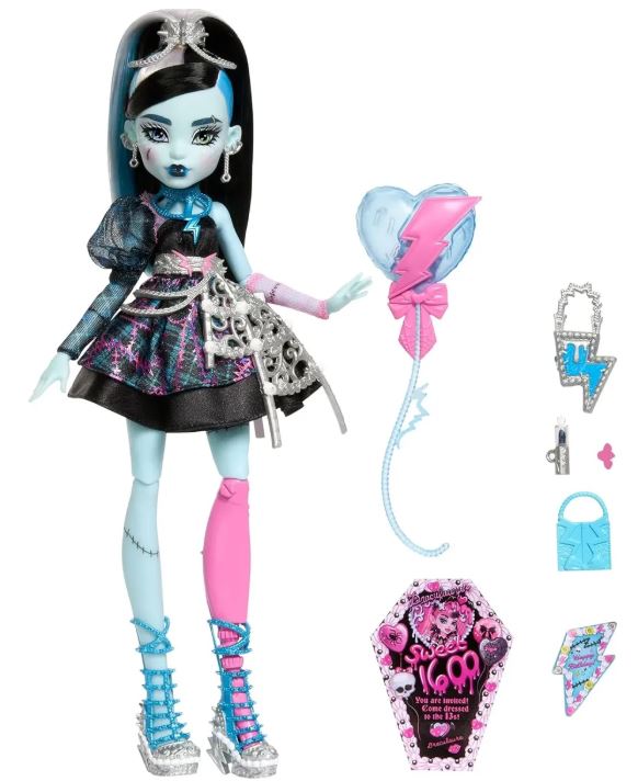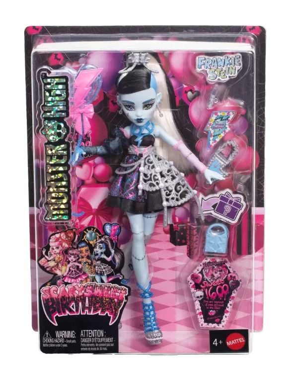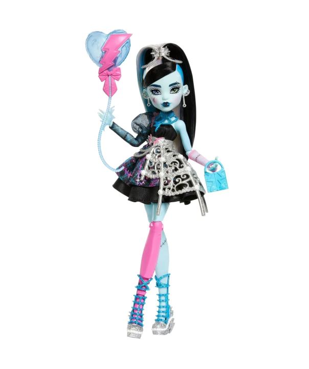 Monster High Muñeca de Cumpleaños Dulce y Aterradora, Frankie Stein en Vestido de Fiesta Negro con Accesorios Temáticos como Invitación, Globo, Juguete, Lápiz Labial y Más