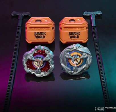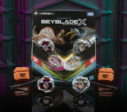 • JURASSIC WORLD BEYBLADE TOPS: 2 poderosos dinosaurios luchan entre sí en tu Beyblade X Beystadium en esta colaboración entre Jurassic World y Beyblade X Spinning Tops