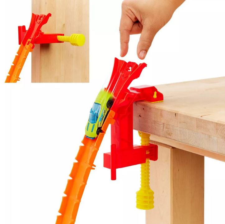 • Gravity Drop: Cuenta con una abrazadera fácil de usar para la caída por gravedad, que lanza los vehículos a toda velocidad por una pendiente con diversas posibilidades de acrobacias.