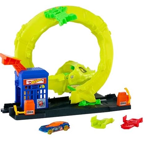 Hot Wheels Juego de pista de coche de juguete, estación de servicio de serpiente con vehículo fundido a presión a escala 1:64, 2 formas de jugar, bucle de sacacorchos y pista de velocidad