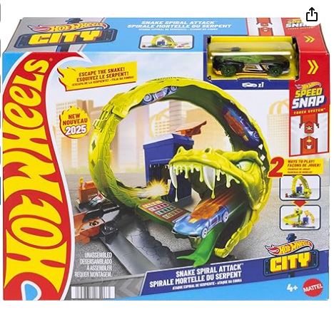 - Los buscadores de emociones y corredores de 3 años en adelante pueden encontrar aventuras ilimitadas con el juego Hot Wheels Snake Spiral Attack