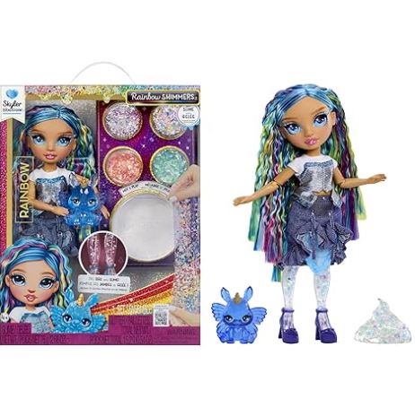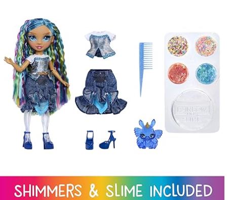 Rainbow High Rainbow Shimmers with Slime – Skyler, muñeca azul de 11 pulgadas, crea una muñeca arcoíris, kit de slime, conejo de mascota